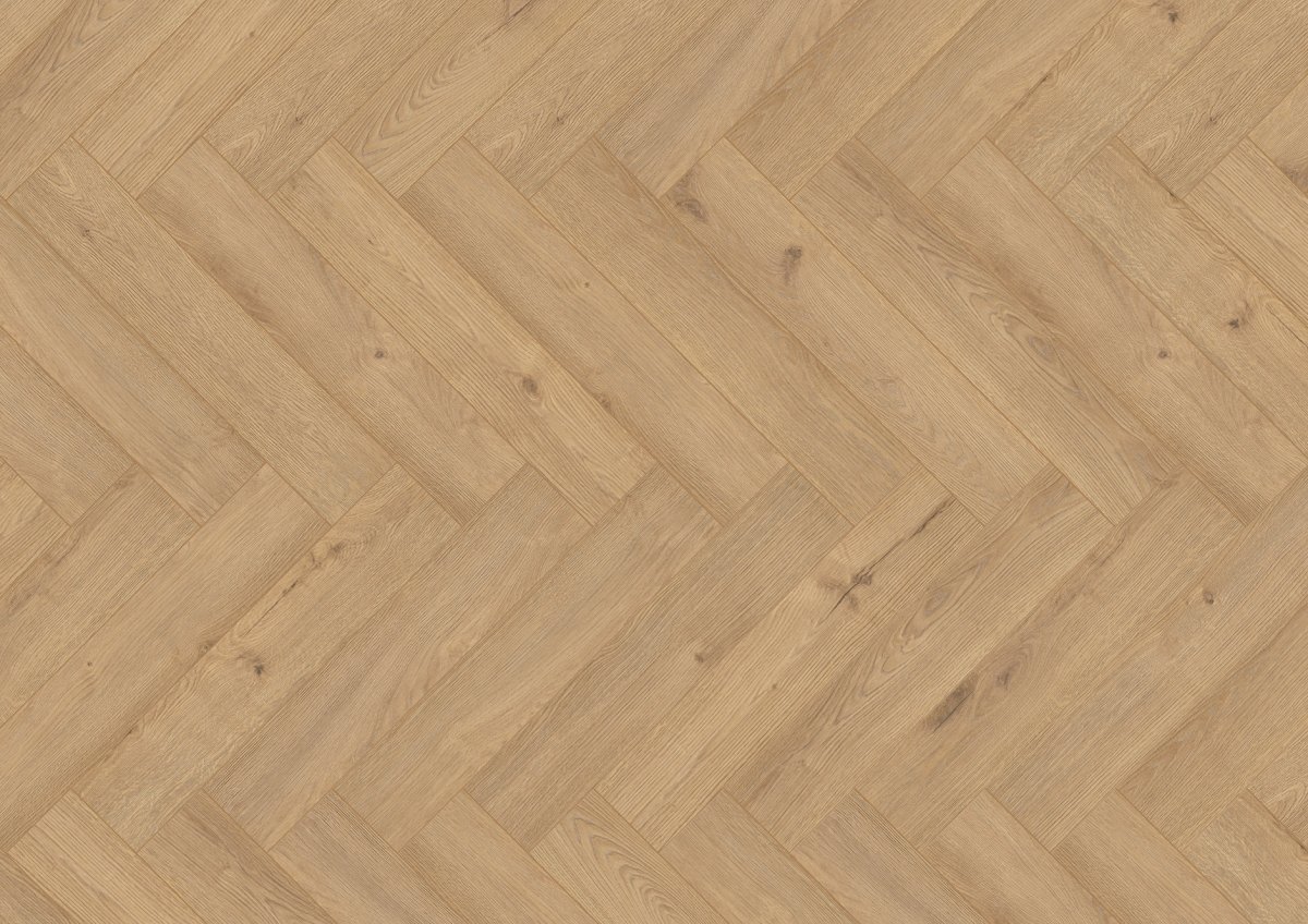 Podłoga laminowana w kolorze Dąb Patio o naturalnej dębowej kolorystyce z kolekcji Herringbone Collection producenta Ter Hürne to eleganckie i przytulne rozwiązanie, które wnosi do wnętrz ciepły, wiejski charakter. Inspirowana klasycznym wzorem jodełki, charakteryzuje się wyrazistą strukturą drewna oraz delikatnie postarzaną, ciepło-miodową kolorystyką, tworząc niepowtarzalny i harmonijny klimat.
