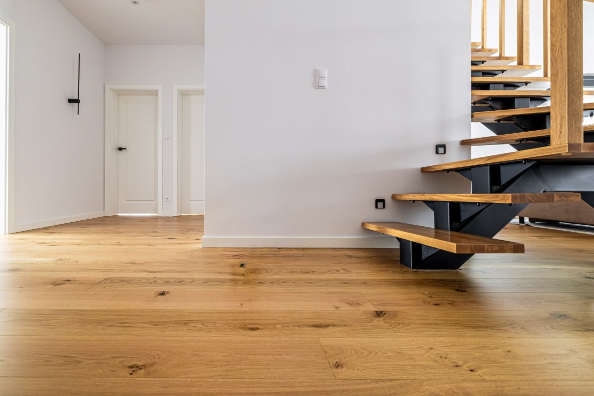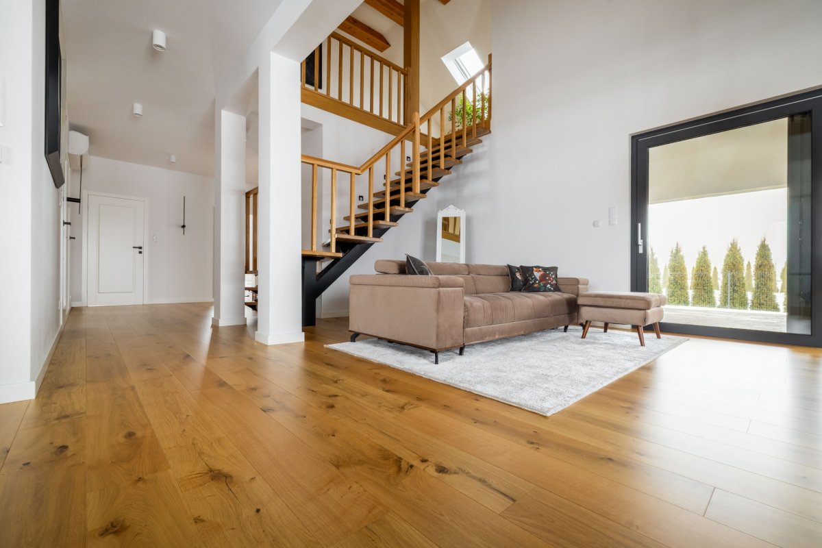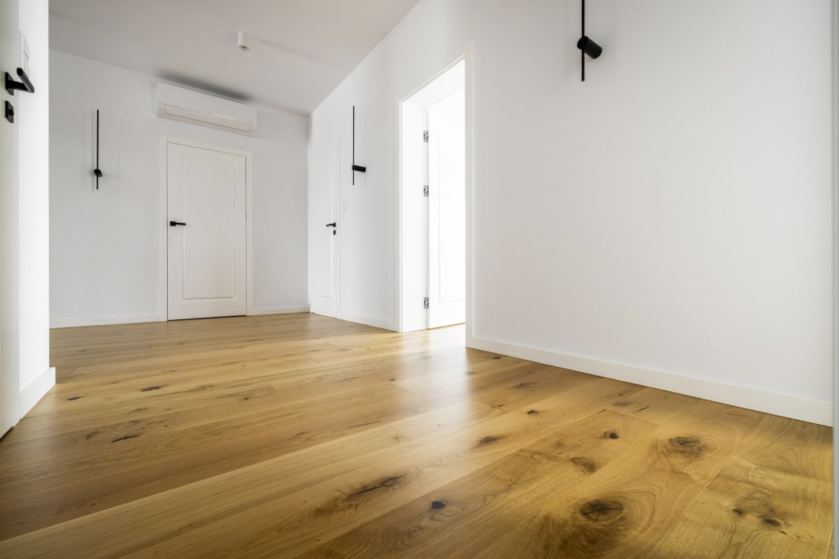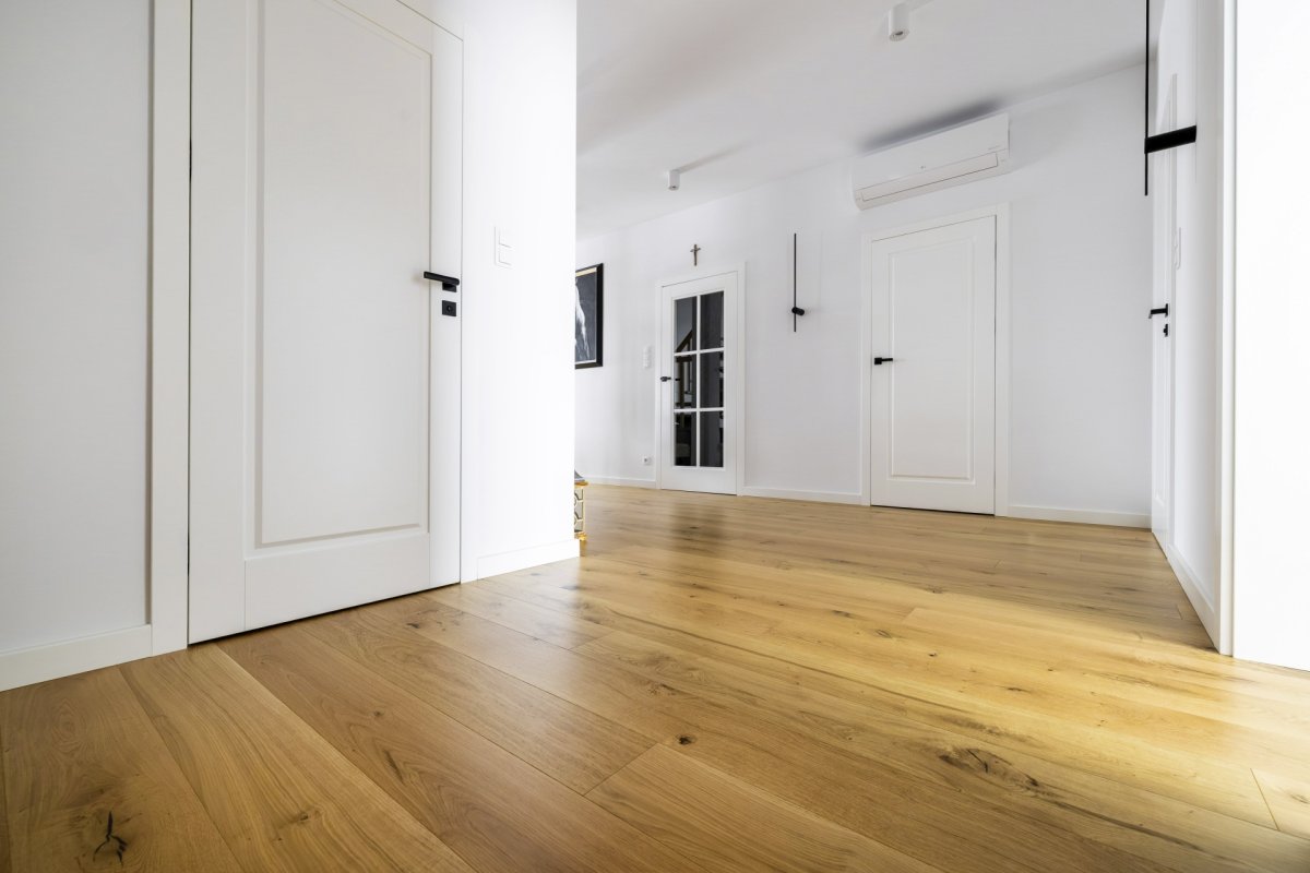 Montaż podłogi drewnianej układanej we wzór deski klasycznej Dąb Cosenza producenta Kährs. Wymiar podłogi: 15x187x2420mm, deska w selekcji Rustykalnej, wykończona lakierem matowym na gładko. Na łączeniu z gresem, oknami balkonowymi została wykonana dylatacja - uzupełniona silikonem pod kolor podłogi.