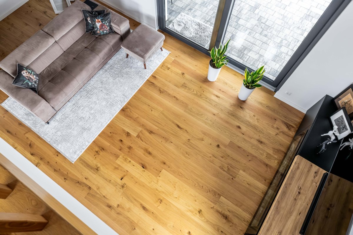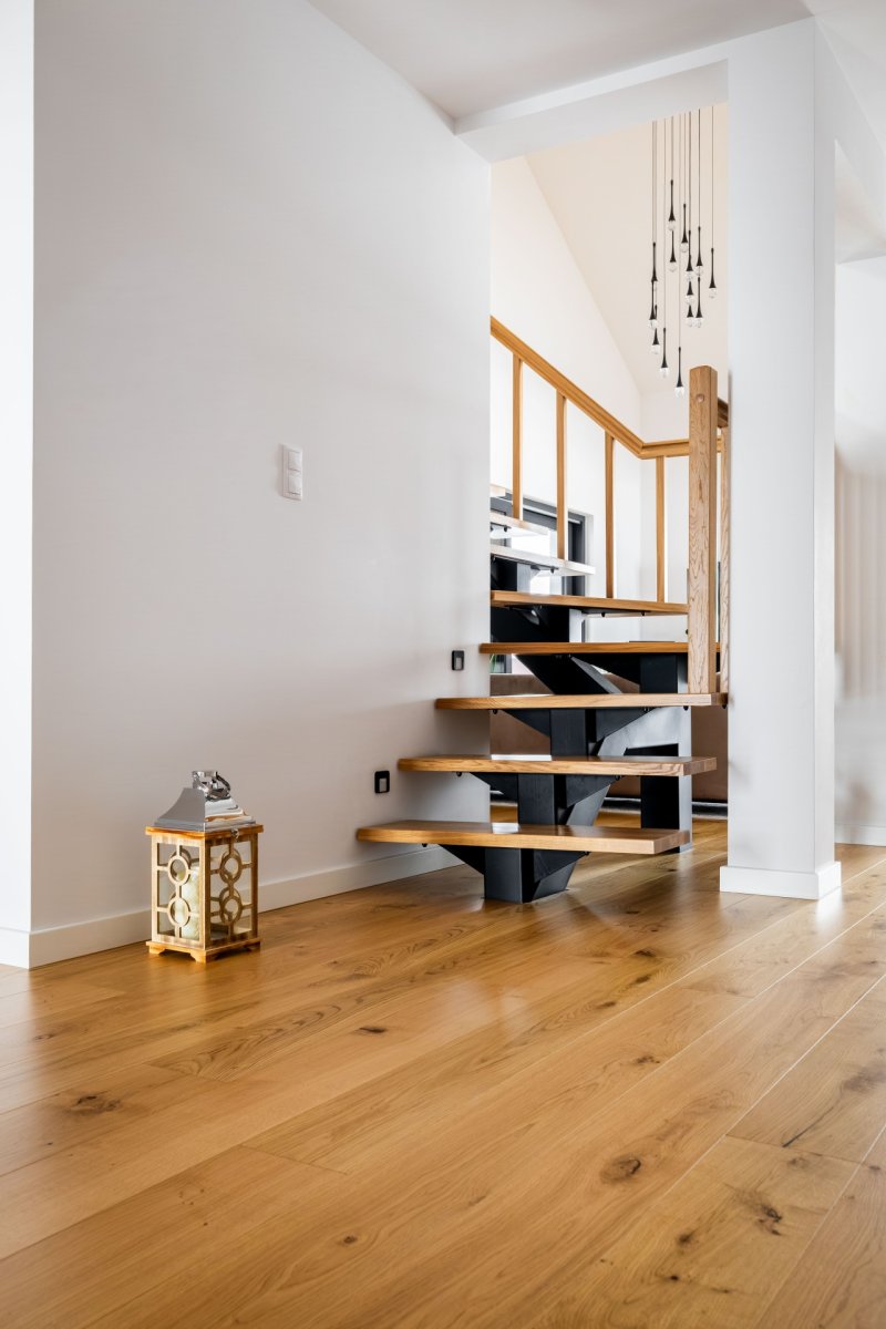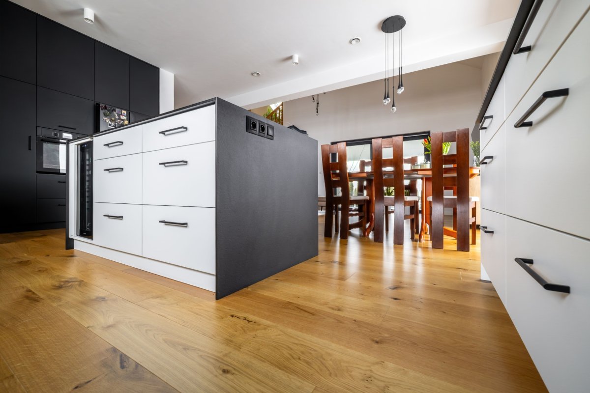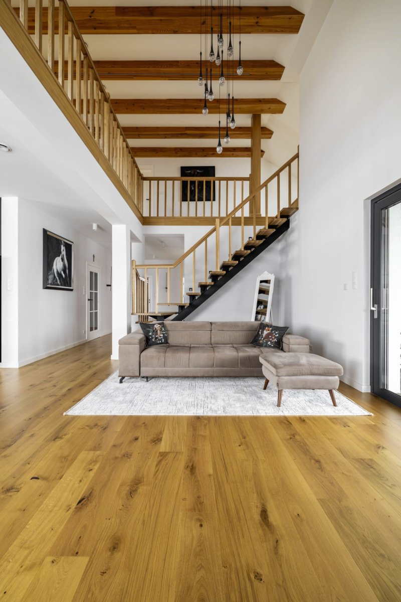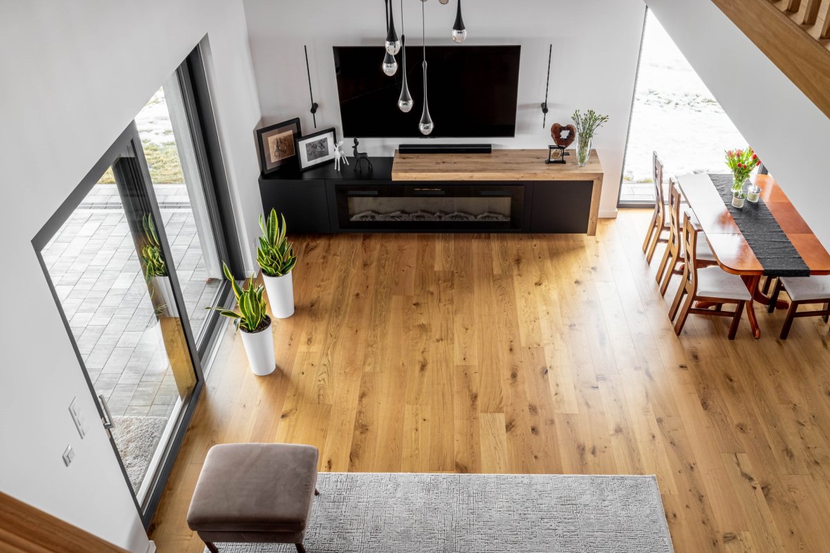 Montaż podłogi drewnianej układanej we wzór deski klasycznej Dąb Cosenza producenta Kährs. Wymiar podłogi: 15x187x2420mm, deska w selekcji Rustykalnej, wykończona lakierem matowym na gładko. Na łączeniu z gresem, oknami balkonowymi została wykonana dylatacja - uzupełniona silikonem pod kolor podłogi.