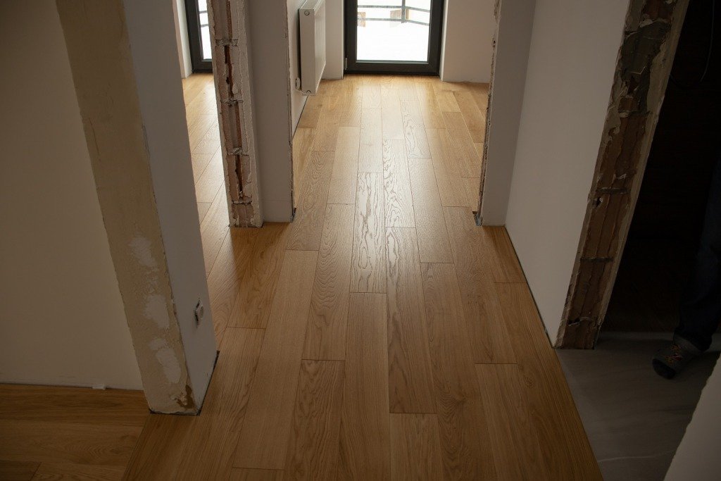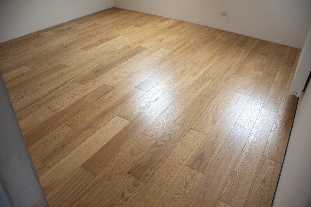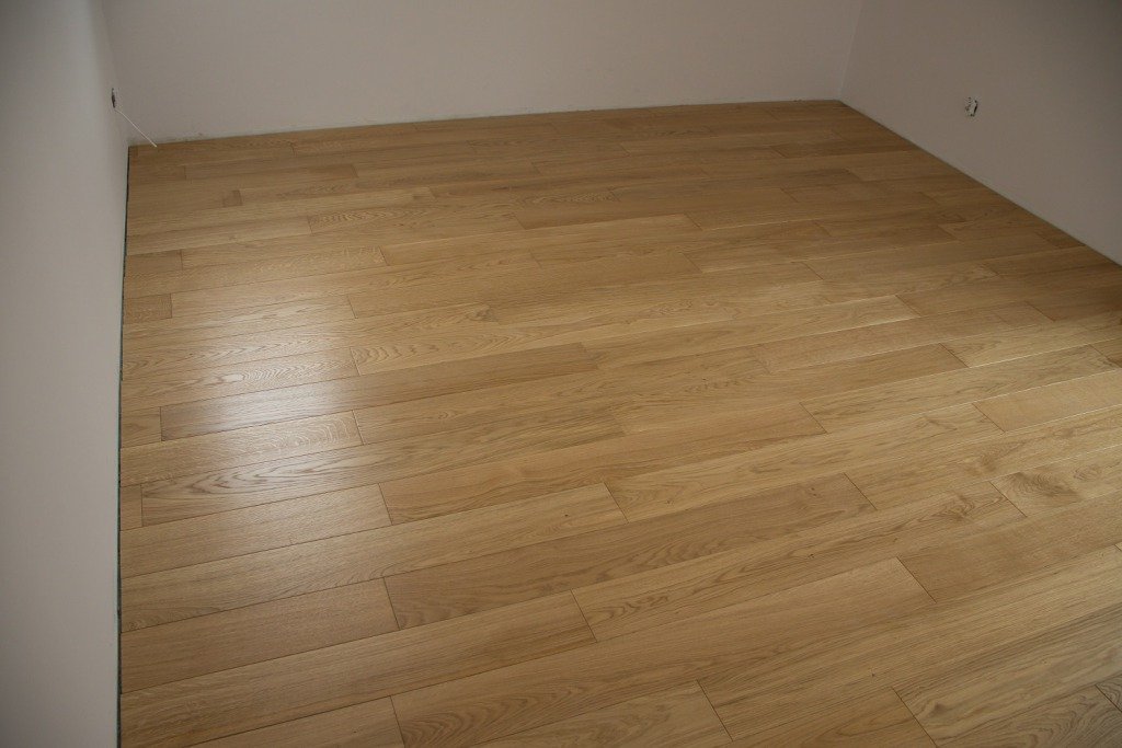 Montaż podłogi w budynku mieszkalnym, Dąb Natura wykończony lakierem, deska szczotkowana i fazowana czterostronnie. W dwóch pomieszczeniach zgodnie z życzeniem klienta został zmieniony kierunek montażu deski. Dodatkowo zostały wykonane uszczelnienia przy drzwiach balkonowych oraz na łączeniach z glazurą silikonem uelastycznionym firmy Beko.