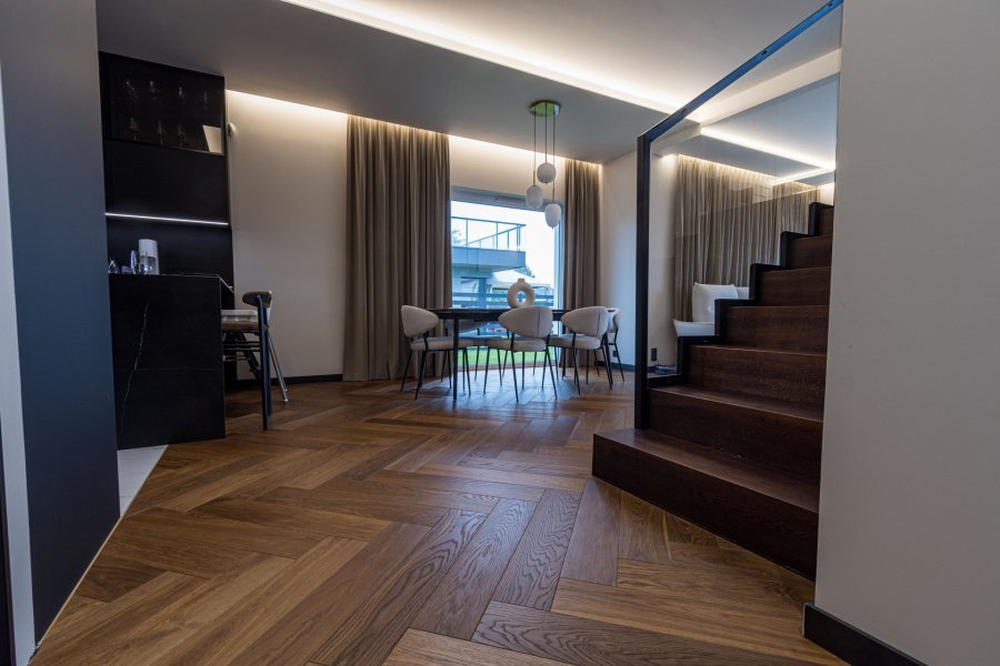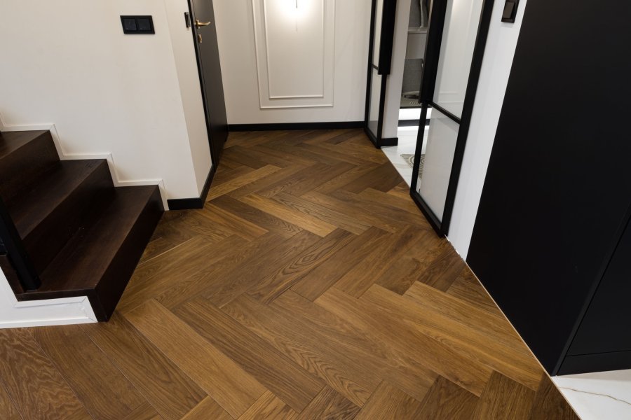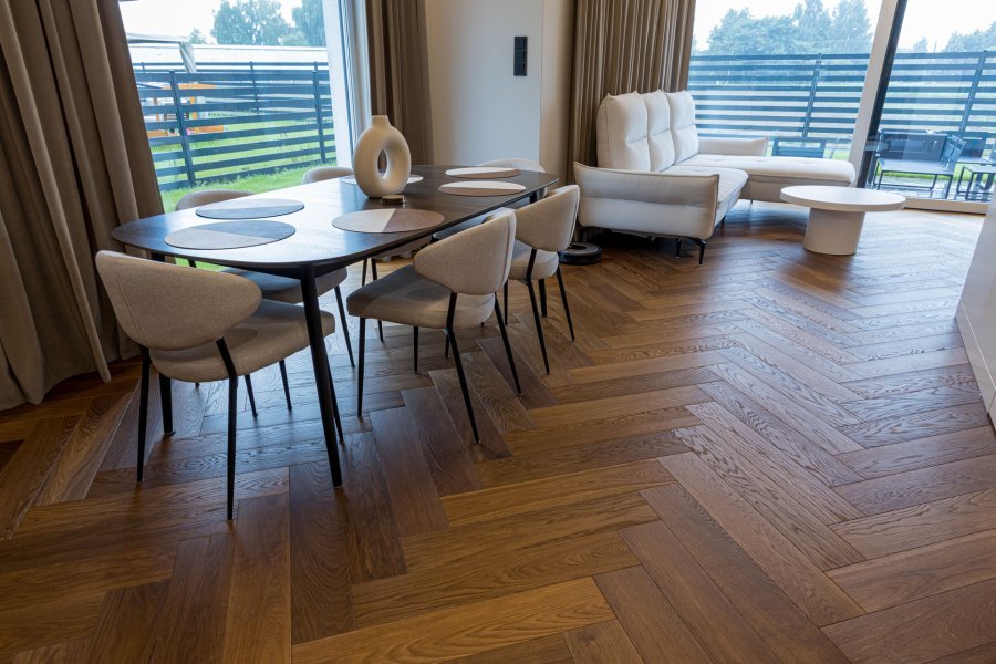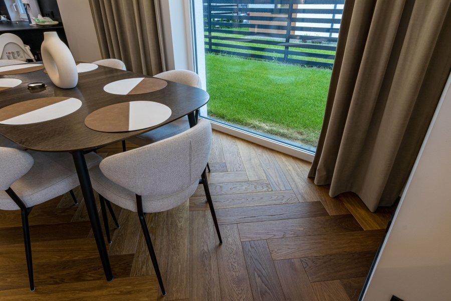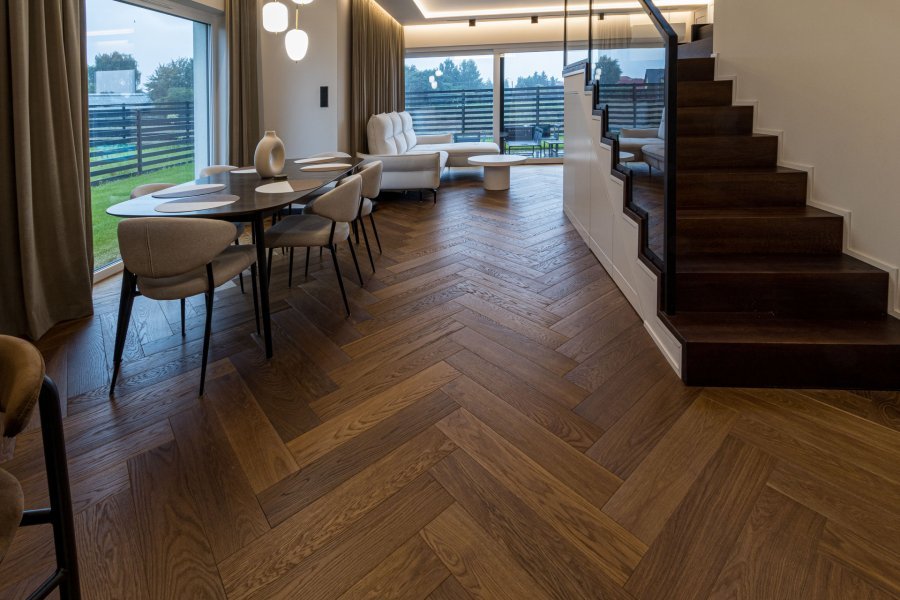 Wykonaliśmy montaż podłogi drewnianej na posadzce w budynku mieszkalnym, Dąb Thermo Antyk klasa Natura producenta FinishParkiet – układany w formie jodły klasycznej w szerokiej desce. Podłoga wykończona woskiem olejnym, szczotkowana, fazowana czterostronnie. Na łączeniu z gresem i oknami tarasowymi została wykonana dylatacja - uzupełniona silikonem uelastycznionym firmy Beko.