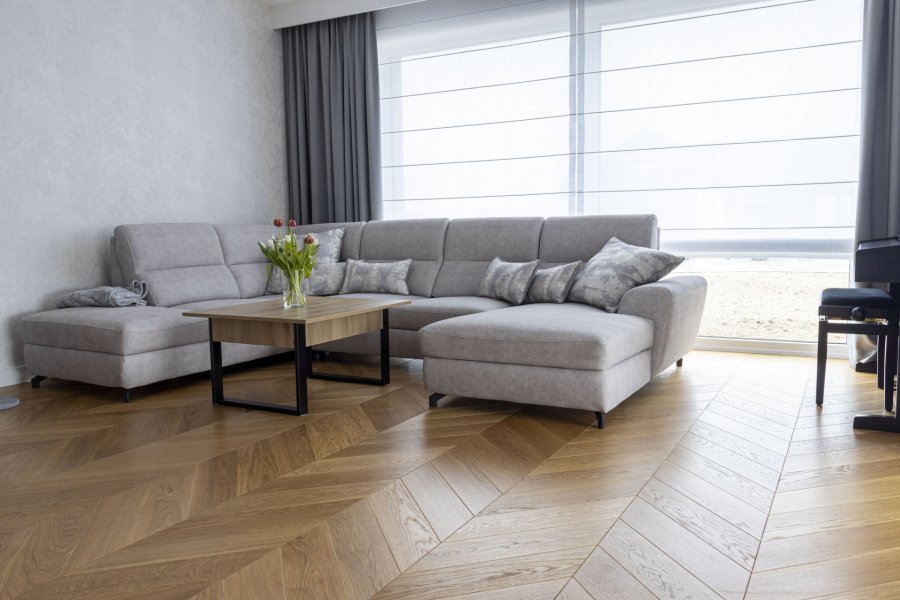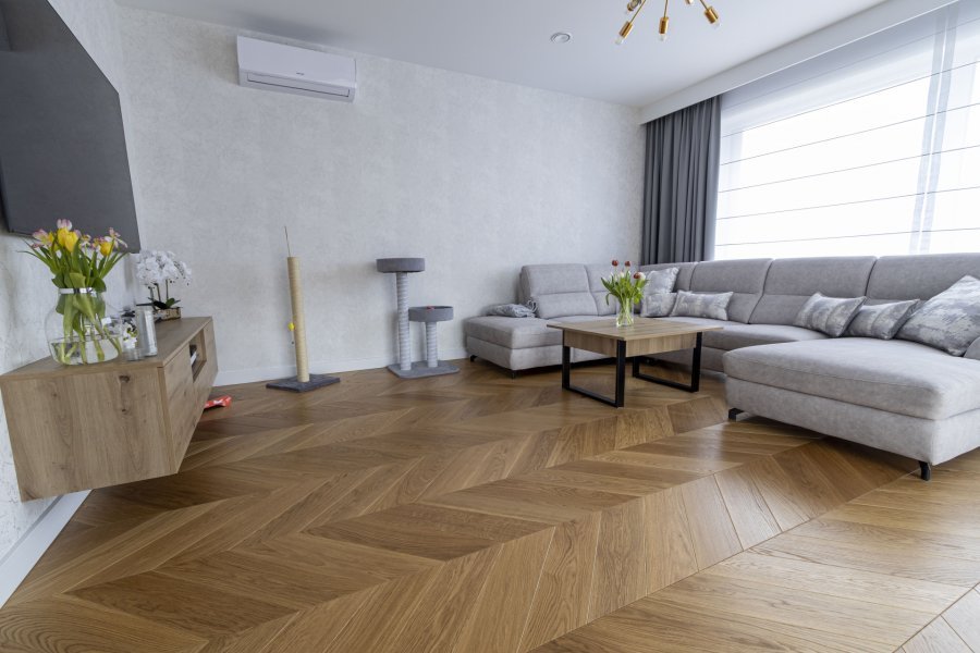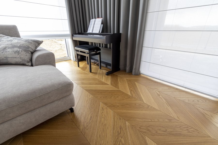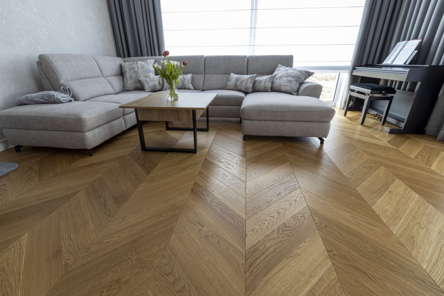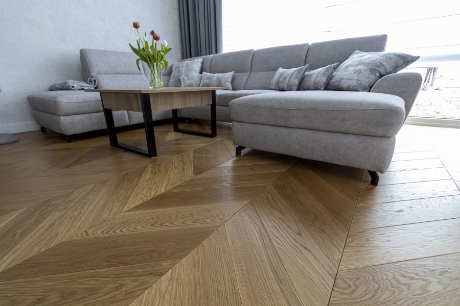Montaż podłogi w budynku mieszkalnym, Dąb Classic kl. Standard – układany w jodełkę francuską. Deska wykończona olejowoskiem, fazowana czterostronnie, dodatkowo podłoga została zabezpieczona środkiem konserwującym od Osmo 3029. Między gresem, a podłogą drewnianą zostały wykonane dylatacje w formie silikonu chemią firmy Beko. W ramach usługi został wykonany także montaż listew przypodłogowych Lagrus Classic R10.