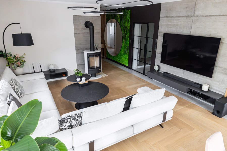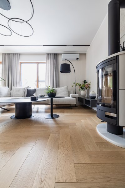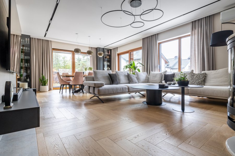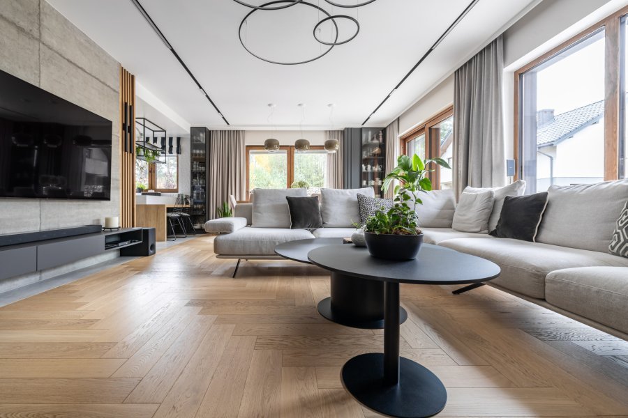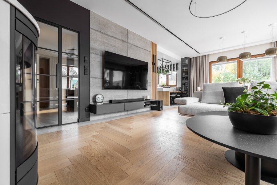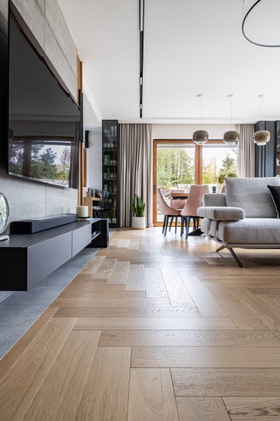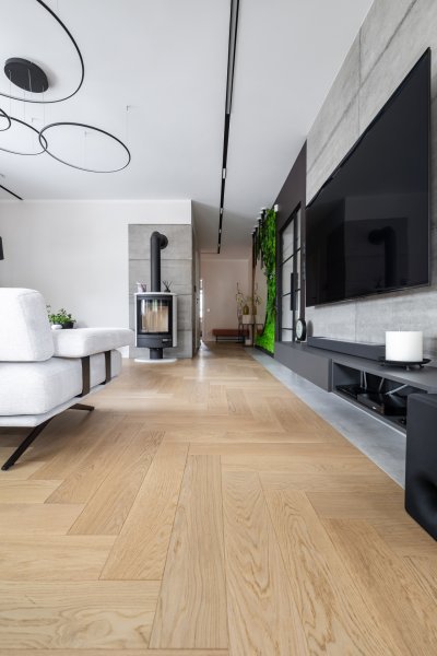 Wykonaliśmy montaż podłogi drewnianej na posadzce w budynku mieszkalnym, Dąb Kastor klasa Standard producenta Parkiet Hajnówka – układany we wzór jodły klasycznej w szerokości 145mm i długości 800mm. Podłoga wykończona woskiem olejnym, szczotkowana, fazowana czterostronnie. Na łączeniu z gresem oraz oknami tarasowymi została wykonana dylatacja - uzupełniona silikonem uelastycznionym firmy Beko. Dodatkowo zostały zamontowane listwy MDF na płycie wilgocioodpornej Classic R1 producenta Lagrus, w kolorze białym oraz czarnym.
