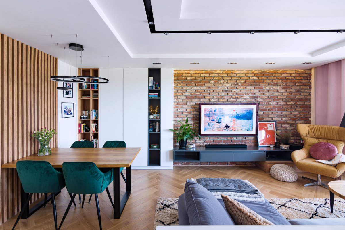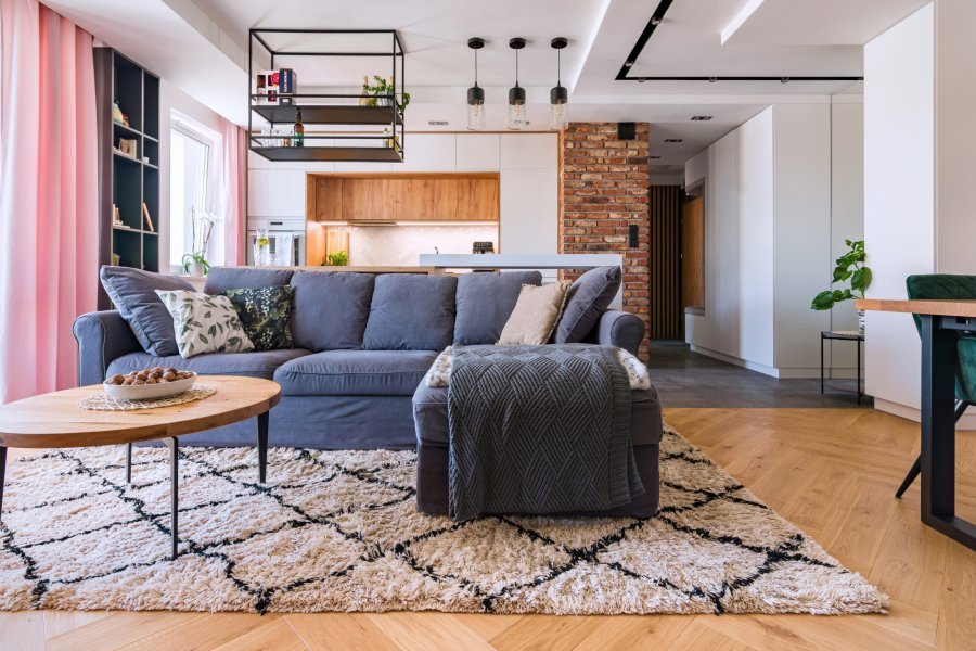 Montaż podłogi drewnianej w budynku mieszkalnym, Dąb Sesame kl. Rustyk – układany w formie jodełki klasycznej. Deska wykończona woskiem olejnym, szczotkowana, fazowana czterostronnie. Między gresem, a podłogą drewnianą zostały wykonane dylatacje w formie silikonu chemią firmy Beko.