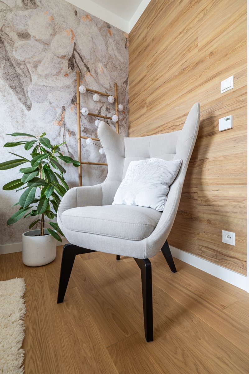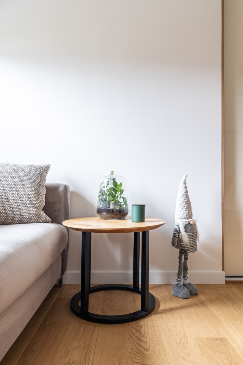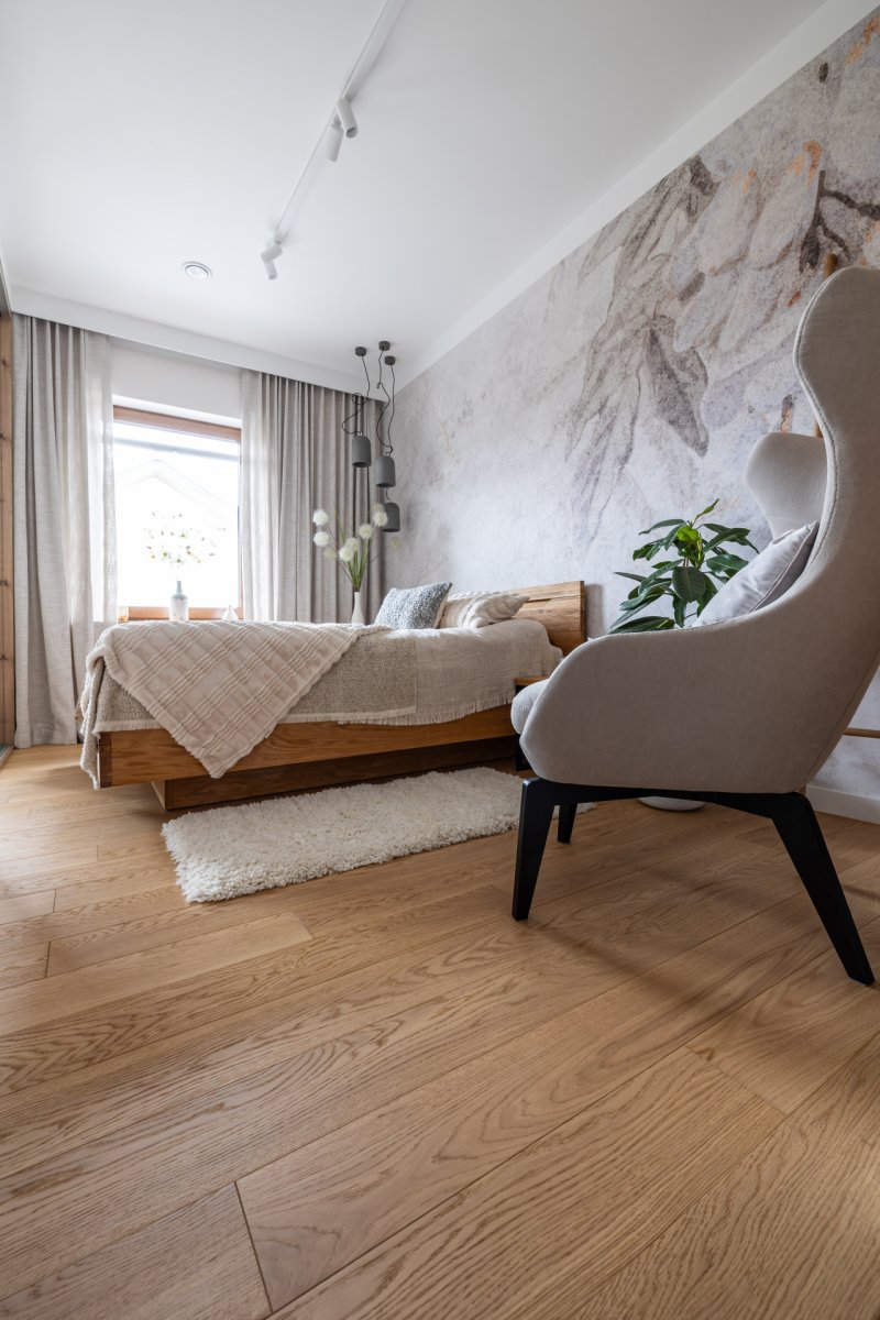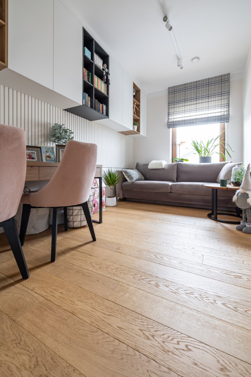 Wykonaliśmy montaż podłogi drewnianej na posadzce w budynku mieszkalnym, Dąb Sesame klasa Standard producenta Parkiet Hajnówka – układany na mijankę w formie deski klasycznej w szerokości 145mm. Podłoga wykończona woskiem olejnym, szczotkowana, fazowana czterostronnie. Na łączeniu z gresem oraz jodłą, która jest ułożona na korytarzu została wykonana dylatacja - uzupełniona silikonem uelastycznionym firmy Beko.