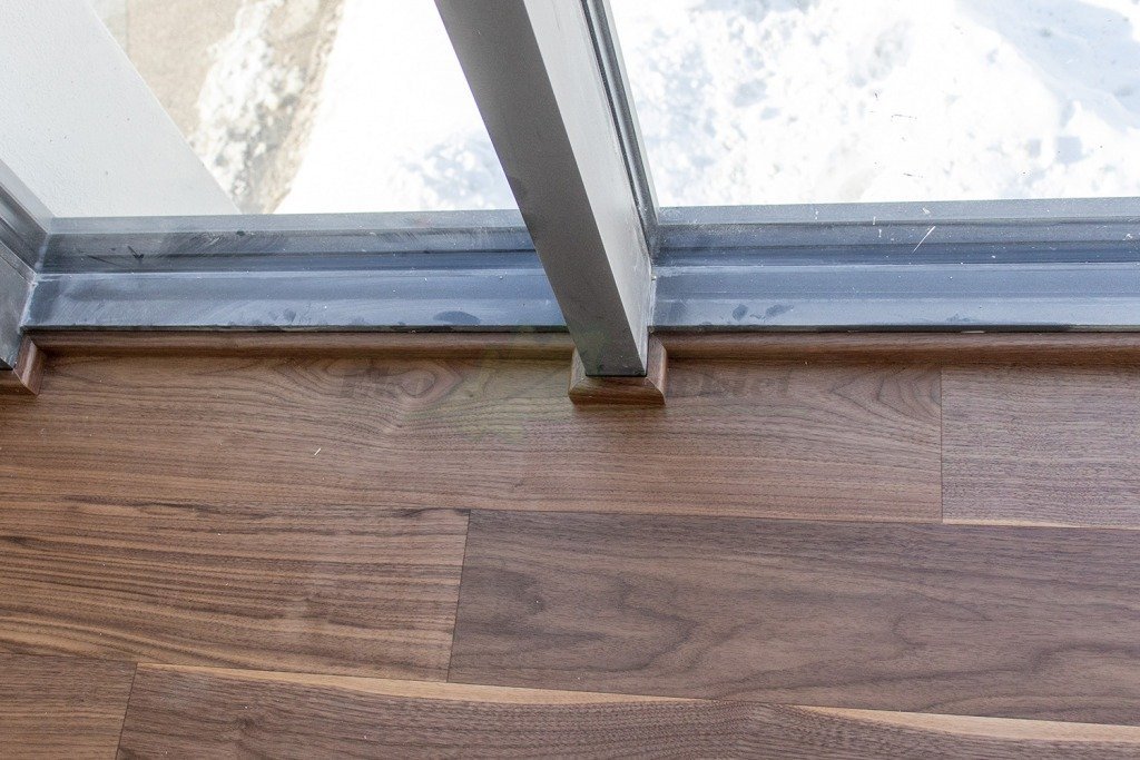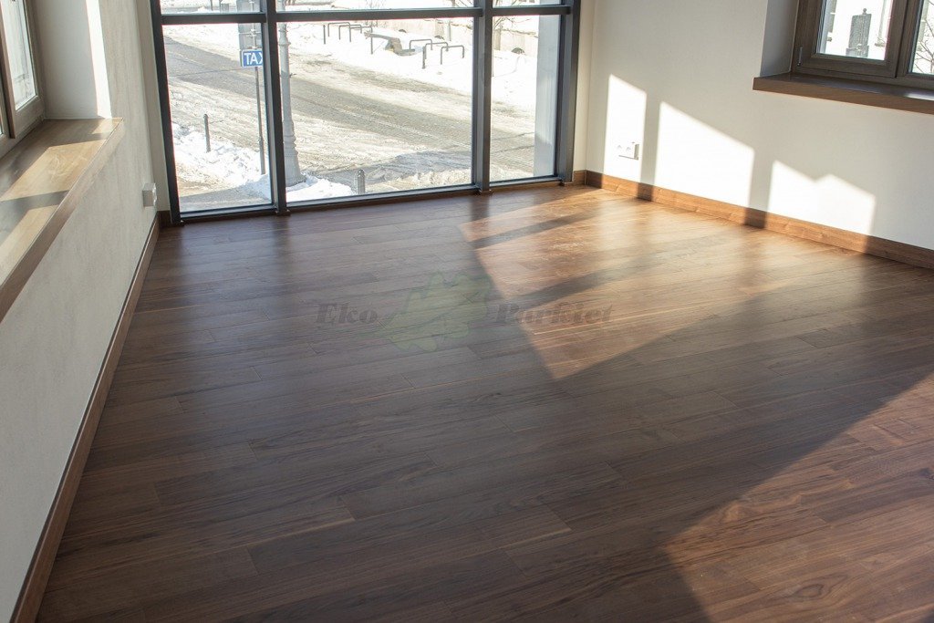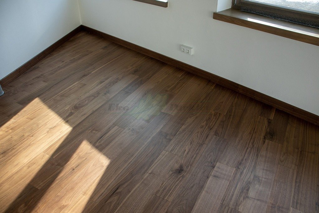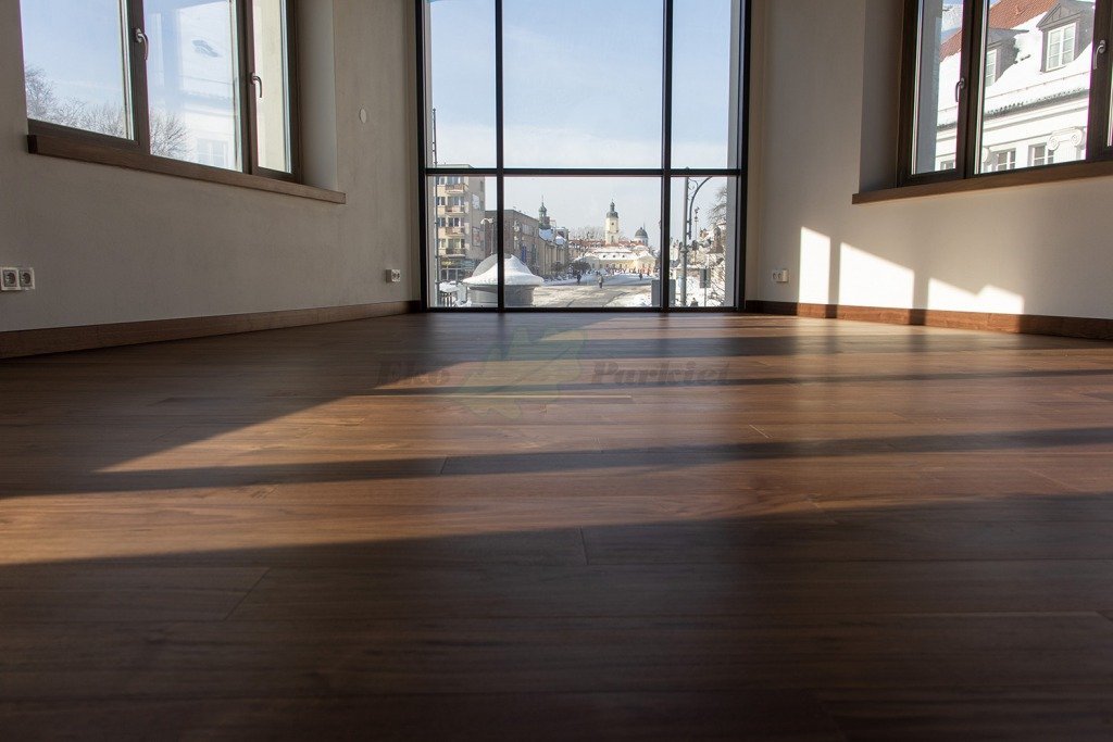 Montaż podłogi w budynku mieszkalno-biurowym, Orzech Amerykański na ‘click’ z zamkiem 5G, z warstwą nośną ‘HDF’. Wykończony lakierem, deska szczotkowana i fazowana czterostronnie. Na ścianach zostały zamontowane listwy przypodłogowe w kolorze podłogi. Na łączeniu z gresem zostało zastosowane uszczelnienie w formie silikonu. Dodatkowo na życzenie klienta podłoga została zabezpieczona środkiem pielęgnacyjnym Polish Plus firmy Bautec.
