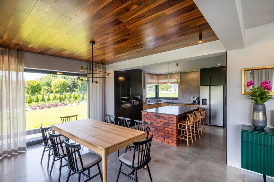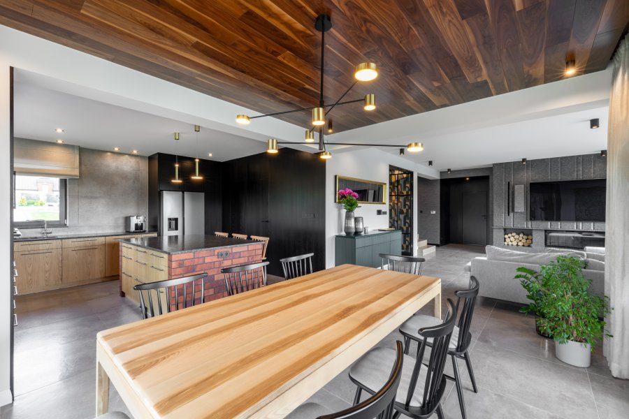 Montaż podłogi drewnianej na suficie w budynku mieszkalnym, Orzech Amerykański kl. Natura – układany w formie deski klasycznej na mijankę. Podłoga wykończona lakierem renowacyjnym na gładko, fazowana czterostronnie. Deska została zacięta dookoła na 45 stopni we wnękach na karnisze pod zasłony. Na łączeniu ze ścianą została wykonana dylatacja i wykończyliśmy ją w formie akrylu w kolorze podłogi. Orzech zamontowaliśmy na przygotowanej przez nas wcześniej konstrukcji na suficie.