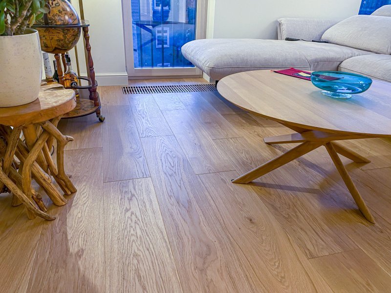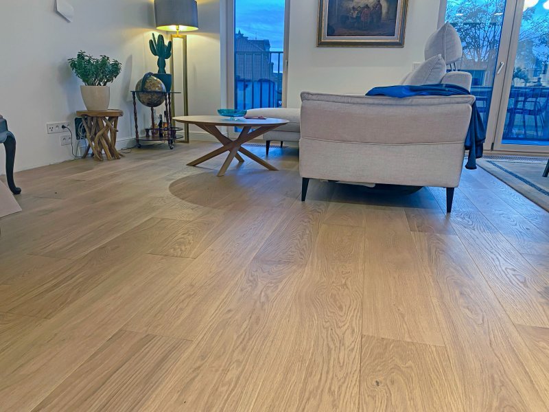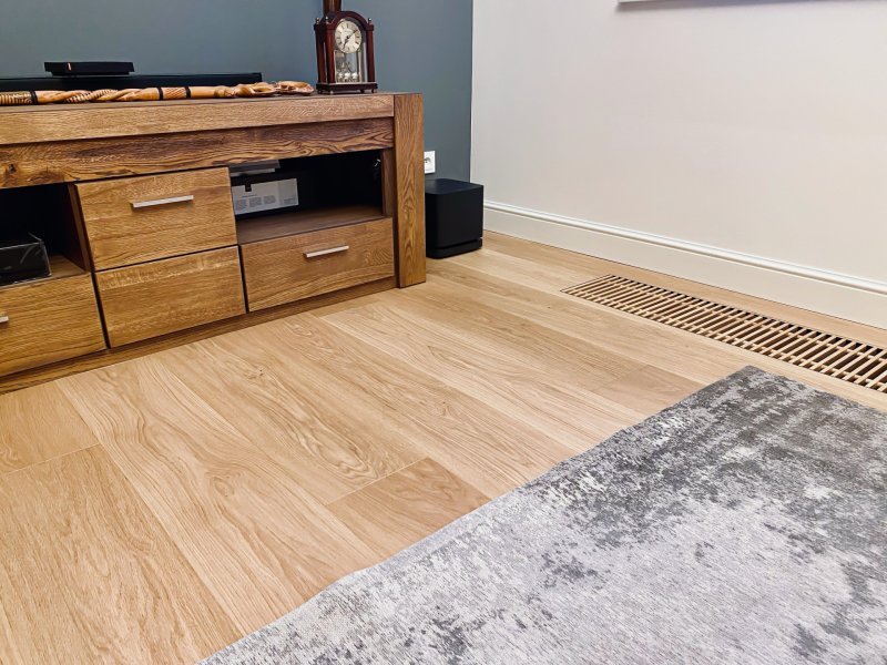 Montaż podłogi w budynku mieszkalnym, Dąb Sesame kl. Standard – układany w formie deski klasycznej. Deska wykończona woskiem olejnym, fazowana czterostronnie, szczotkowana. Między gresem, a podłogą drewnianą zostały wykonane dylatacje w formie silikonu chemią firmy Beko. Dodatkowo podłoga po ułożeniu została zabezpieczona woskiem regeneracyjnym Osmo 3079.
