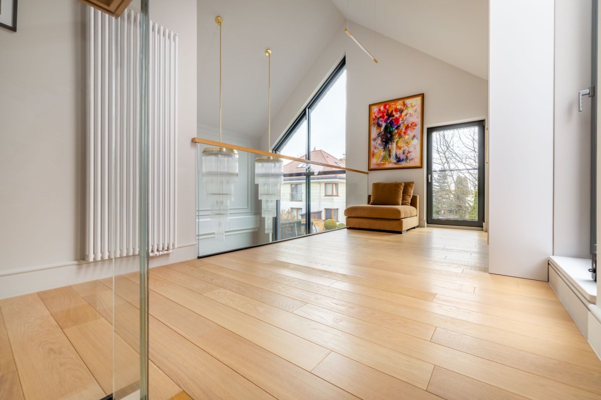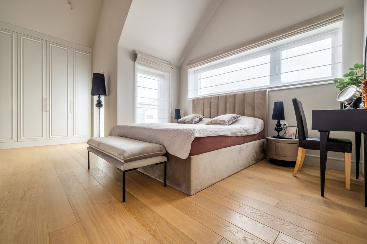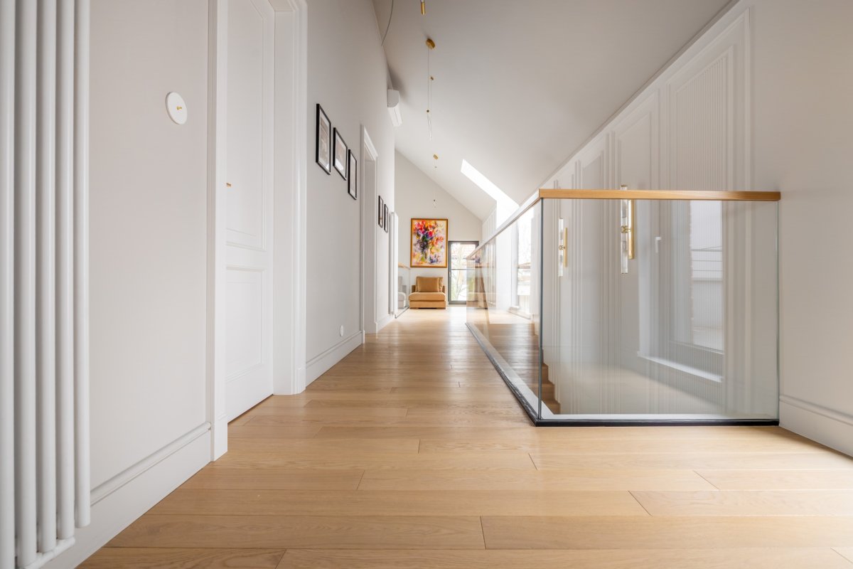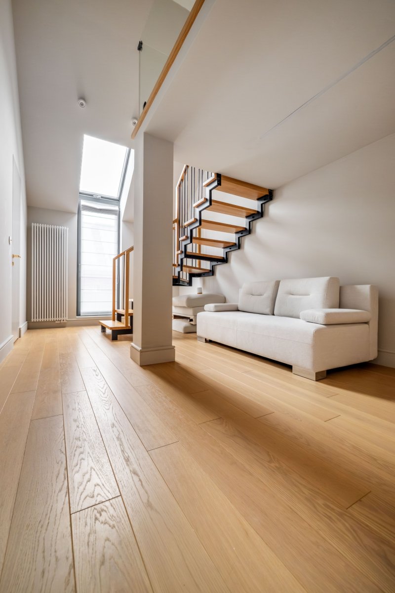 Montaż podłogi drewnianej układanej we wzór deski klasycznej na mijankę Dąb Caldos producenta Parkiet Hajnówka. Wymiar podłogi: 15x145x500-2200mm, deska w najwyższej klasie selekcji 'Natur' wykończona woskiem olejnym na gładko. Na łączeniu z gresem, oknami balkonowymi została wykonana dylatacja - uzupełniona silikonem pod kolor podłogi.