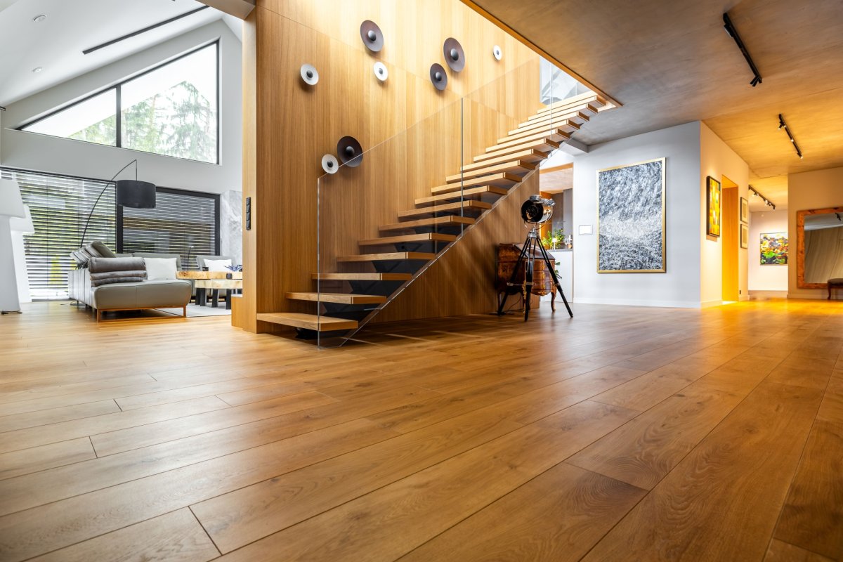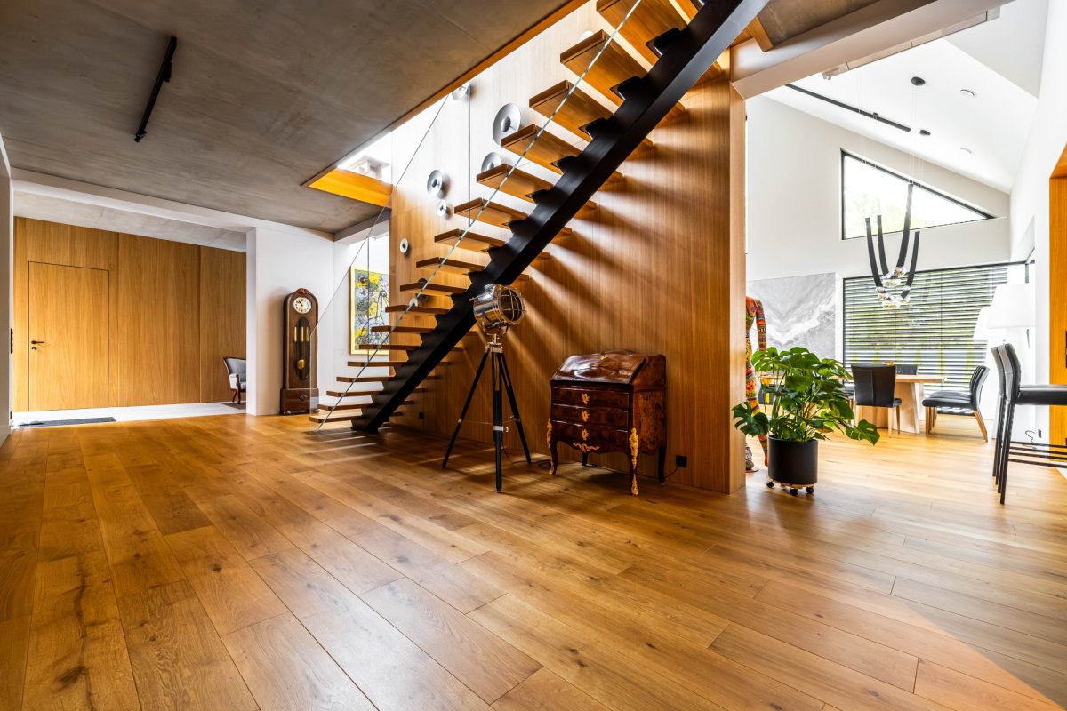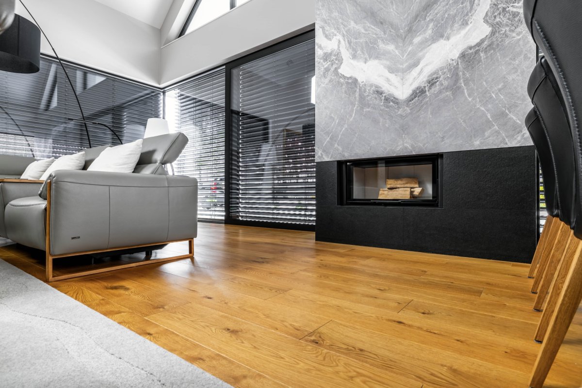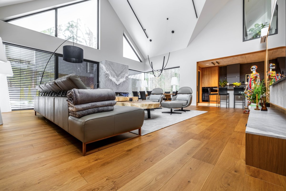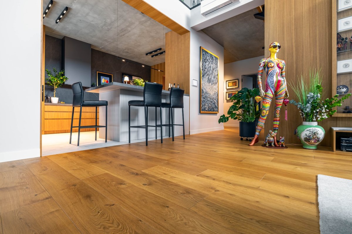 Montaż podłogi drewnianej układanej we wzór deski klasycznej na mijankę Dąb Classic klasa Rustyk producenta Parkiet Hajnówka. Wymiar podłogi: 15x220x500-2200mm, deska wykończona twardym woskiem olejnym, szczotkowana. Na łączeniu z gresem, oknami balkonowymi została wykonana dylatacja - uzupełniona silikonem pod kolor podłogi.