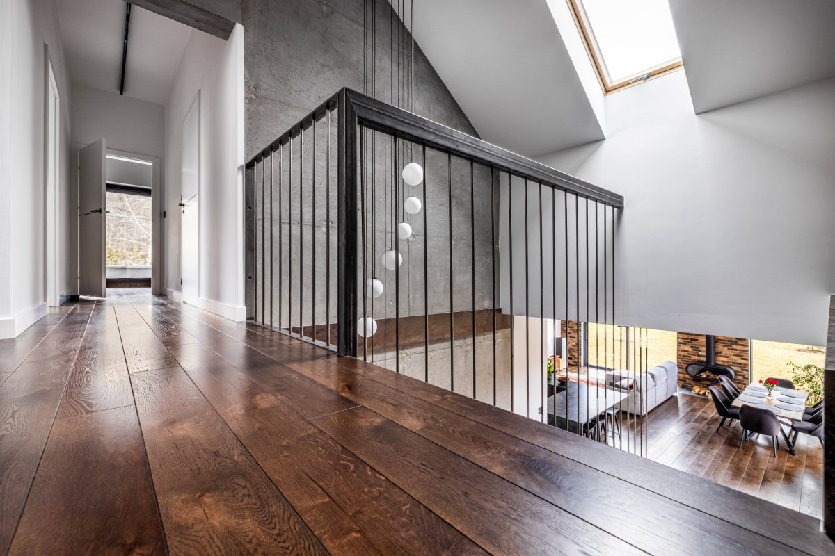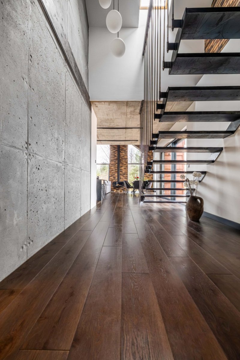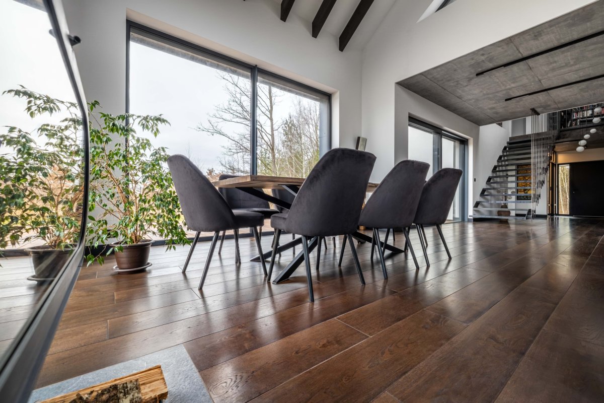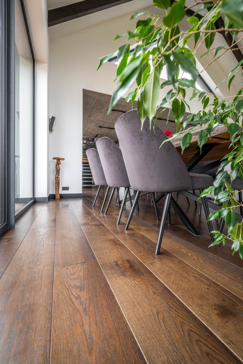 Montaż podłogi drewnianej układanej we wzór deski klasycznej na mijankę Dąb Terra klasa Rustyk producenta Parkiet Hajnówka. Wymiar podłogi: 15x220x500-2200mm - parter, 15x145x500-2200mm - piętro, deska wykończona twardym woskiem olejnym, szczotkowana. Na łączeniu z gresem, oknami balkonowymi została wykonana dylatacja - uzupełniona silikonem pod kolor podłogi.