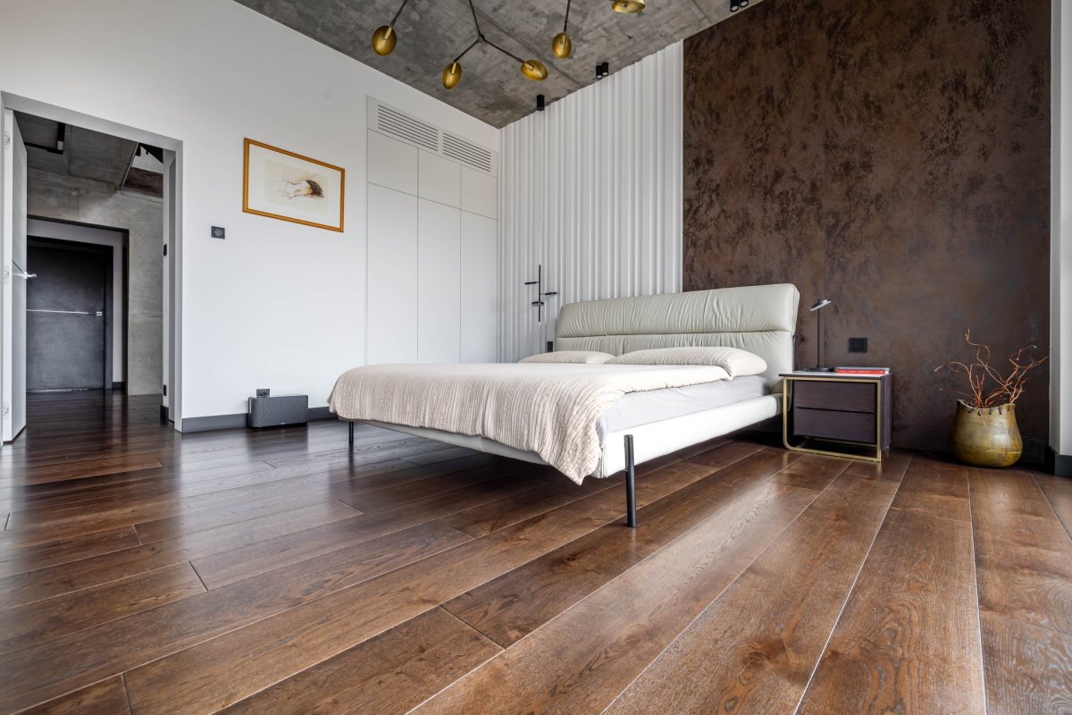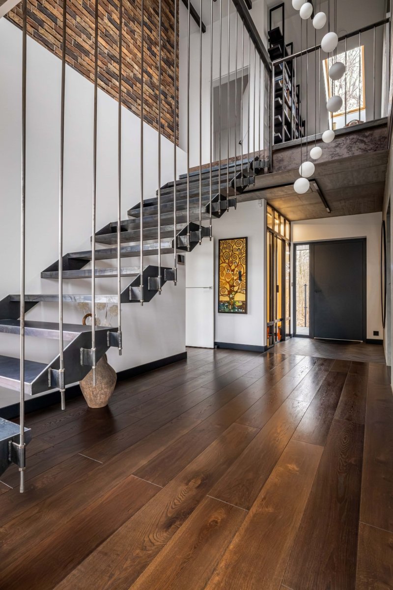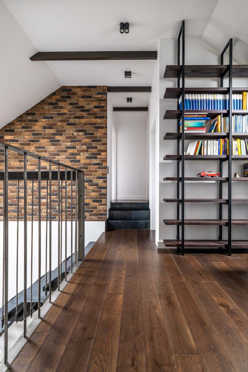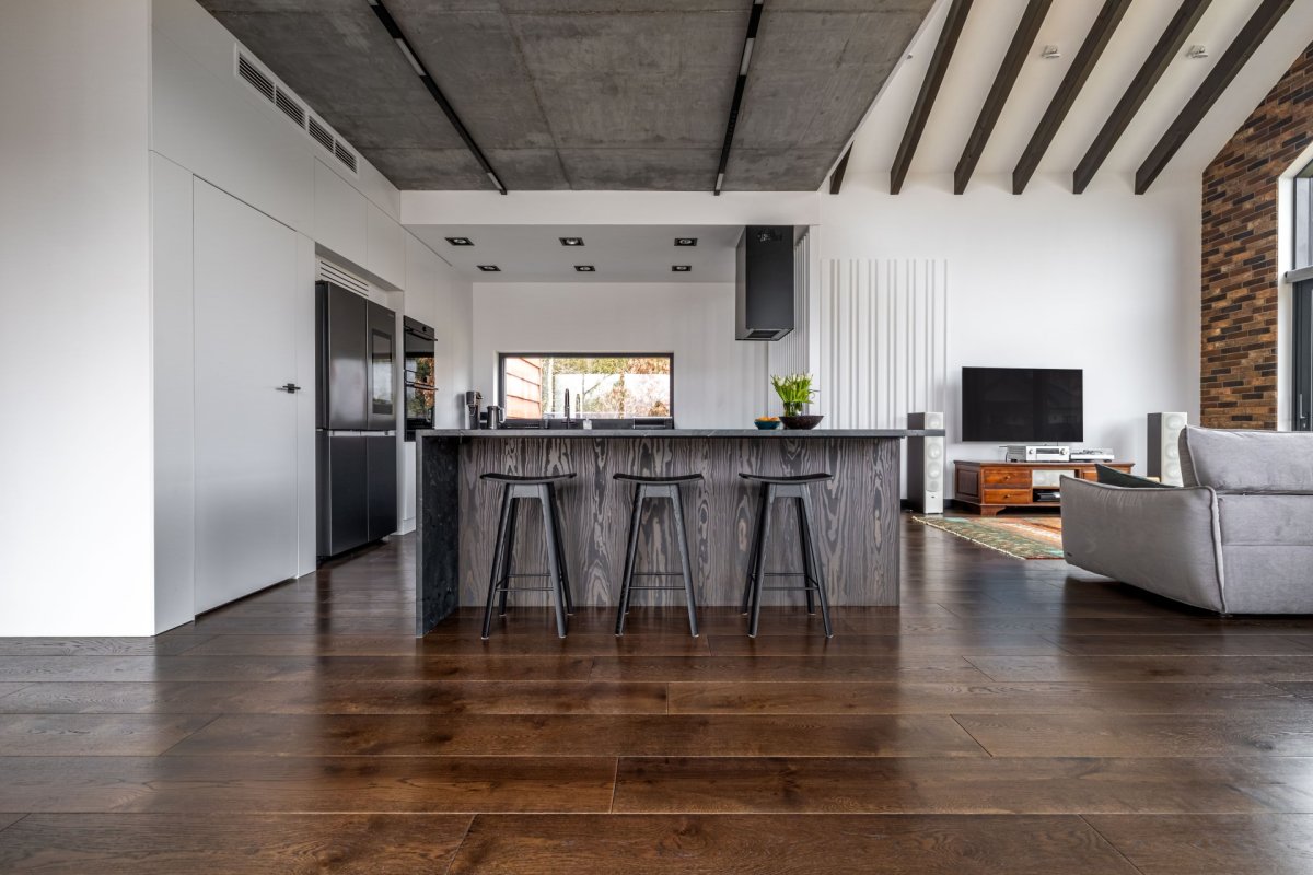Montaż podłogi drewnianej układanej we wzór deski klasycznej na mijankę Dąb Terra klasa Rustyk producenta Parkiet Hajnówka. Wymiar podłogi: 15x220x500-2200mm - parter, 15x145x500-2200mm - piętro, deska wykończona twardym woskiem olejnym, szczotkowana. Na łączeniu z gresem, oknami balkonowymi została wykonana dylatacja - uzupełniona silikonem pod kolor podłogi.