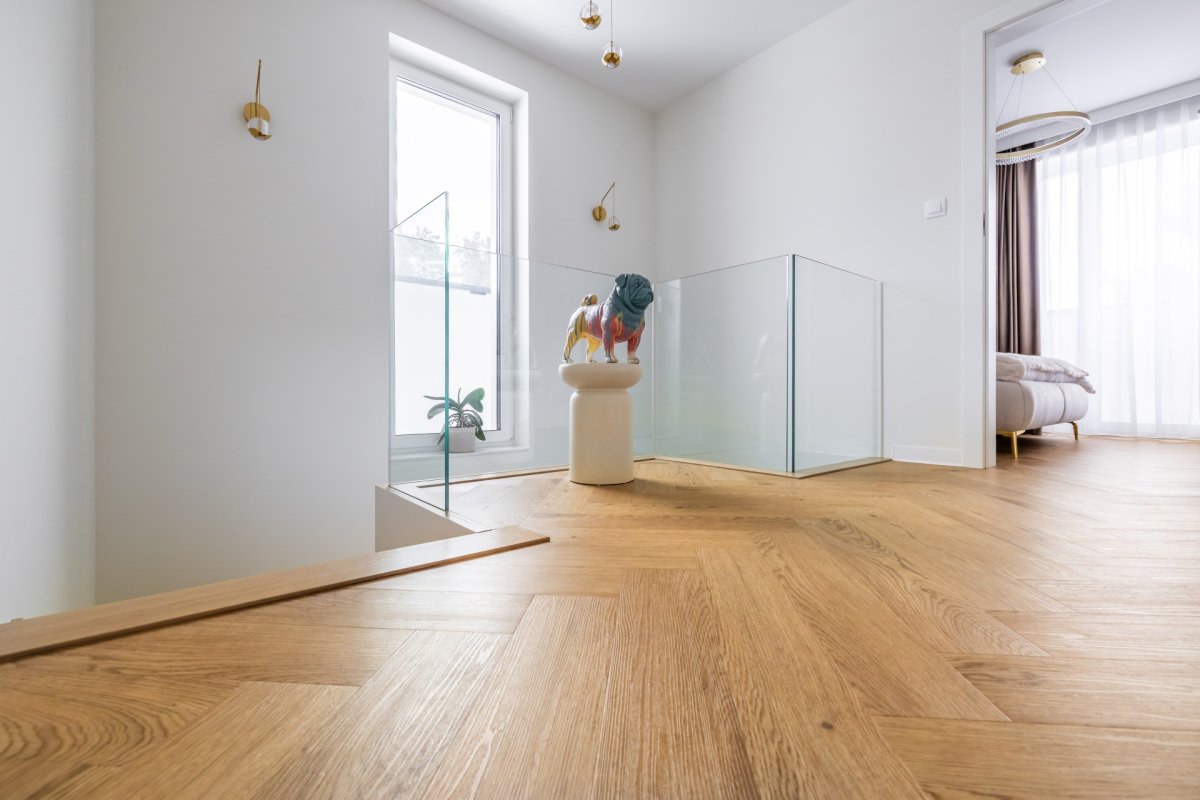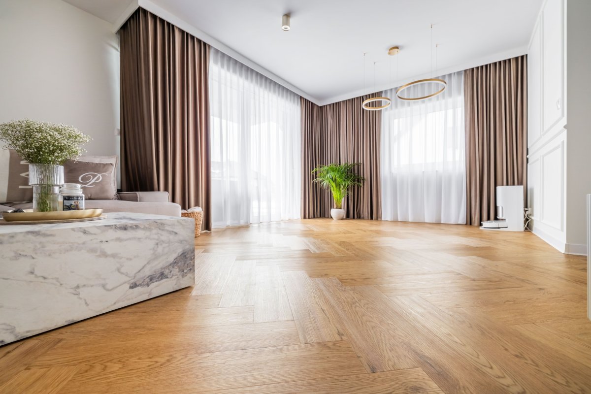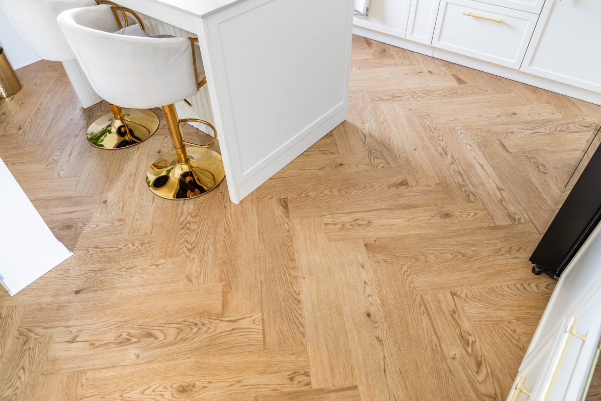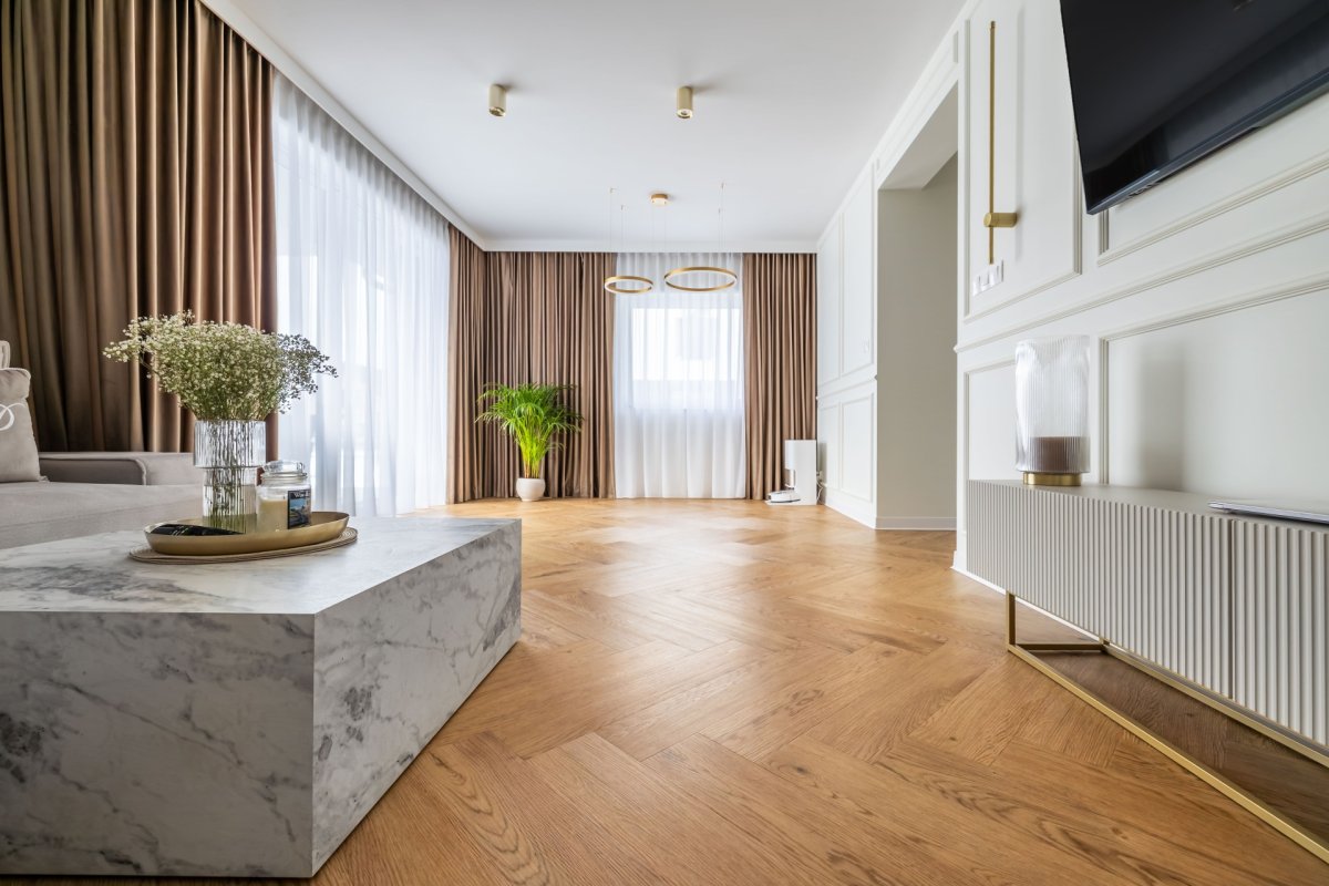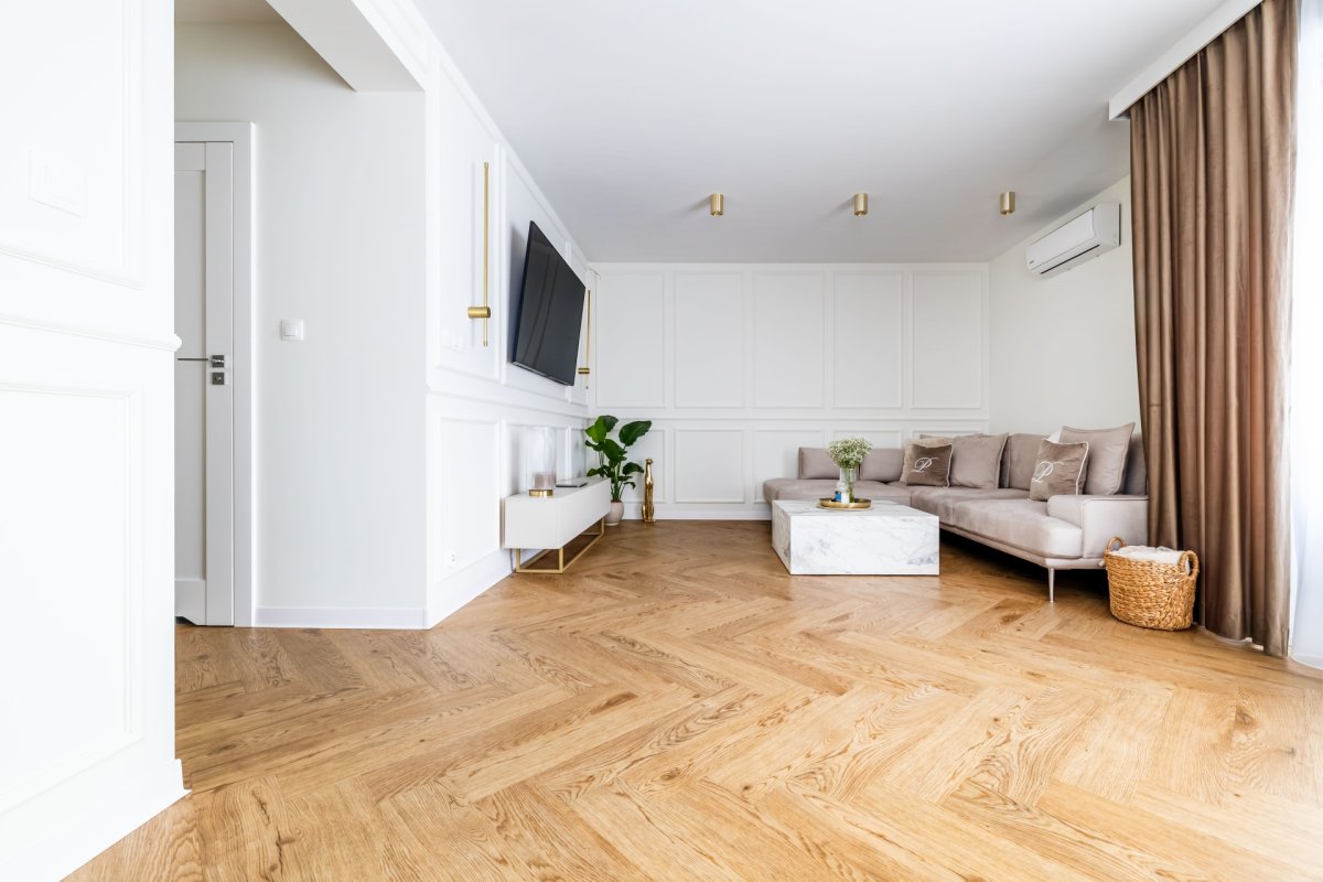 Montaż podłogi winylowej układanej we wzór jodły klasycznej Dąb York PRO producenta Ter Hürne. Wymiar podłogi: 2,5x149,9x749,3mm, podłoga wykończona twardym lakierem, synchronicznie tłoczona. Ze względu na zastosowanie winyla o grubości 2,5mm w wersji DryBack wykonaliśmy na inwestycji wylewkę samopoziomującą. Na łączeniu z gresem, oknami balkonowymi została wykonana dylatacja - uzupełniona silikonem pod kolor podłogi.