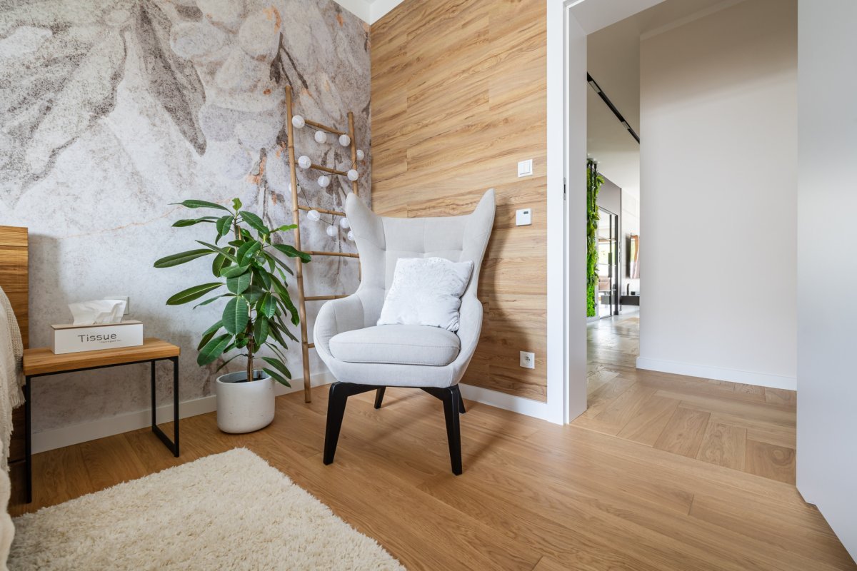 Montaż podłogi poliuretanowej (ekologicznej) o parametrach klasy użytkowej 23/33/42 w budynku mieszkalnym, Canyon Oak z kolekcji Wineo 1000 Wood XXL został przyklejony do ściany za pomocą kleju Uzin KE 60. Produkt ma strukturę deski drewnianej szczotkowanej.